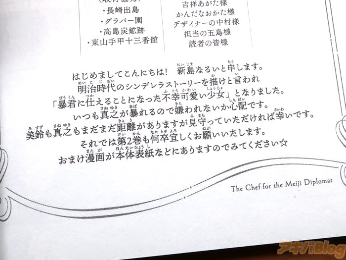 なかがきで、作者:新島なるい氏は『明治時代のシンデレラストーリーを描けと言われ、「暴君に仕えることになった不幸可愛い少女」となりました。いつも真之が暴れるので、嫌われないか心配です。美鈴も真之もまだまだ距離がありますが、見守っていただければ幸いです』などを書かれている。
