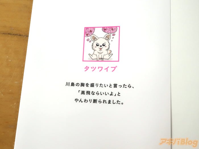 カバー折り返しで作画:タツワイプ氏は『川島の胸を盛りたいと言ったら、「高飛ならいいよ」とやんわり断られました』と書かれている。