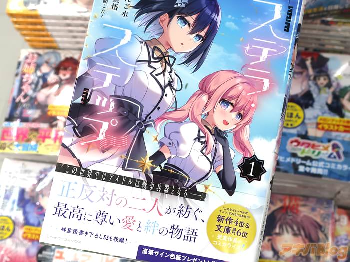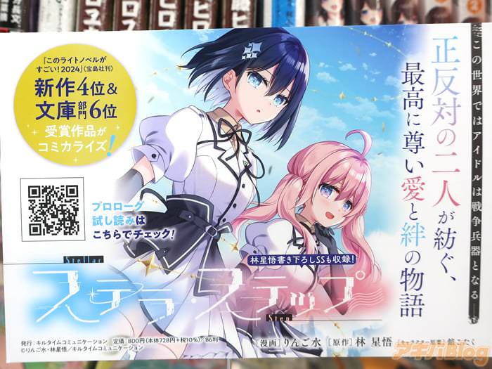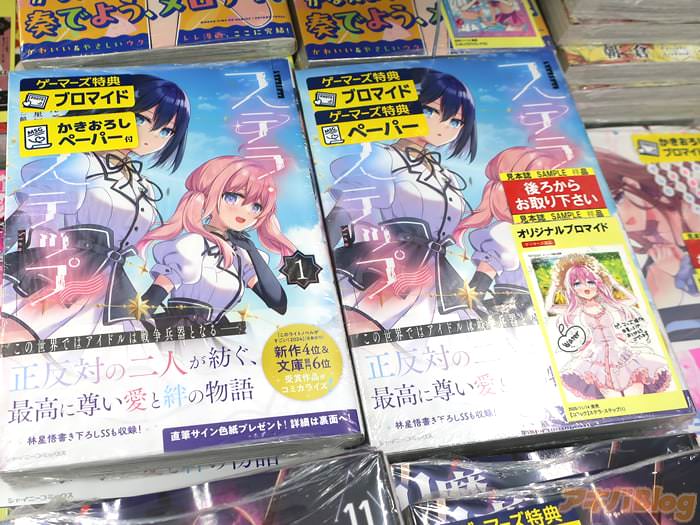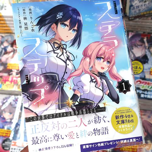 林星悟的轻小说、りんご水作画的漫画版「ステラ・ステップ」第1卷【AA】于秋叶原发售。オビが『正反対の二人が紡ぐ、最高に尊い愛と絆の物語』、コミックス情報が『ライブ勝負が戦争の代替行為』、販促POPは『この世界ではアイドルは戦争兵器となる――』。