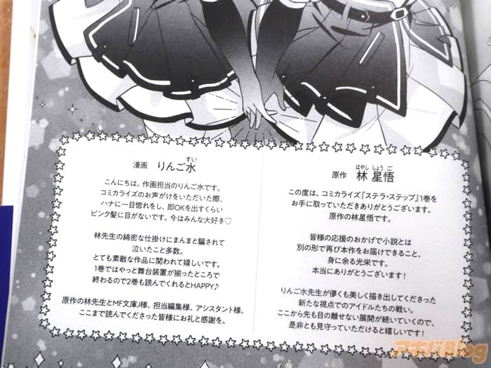 あとがきで『りんご水先生が儚くも美しく描き出してくださった、新たな視点でのアイドルたちの戦い。ここから先も目の離せない展開が続いていくので、是非とも見守っていただけると嬉しいです!』などを、漫画:りんご水氏は同じくあとがきで『とても素敵な作品に関われて嬉しいです。1巻ではやっと舞台装置が揃ったところで終わるので2巻も読んでくれるとHAPPY♪』などを書かれている。