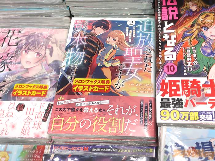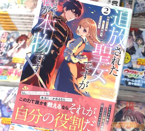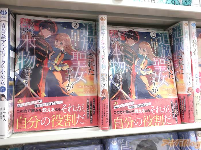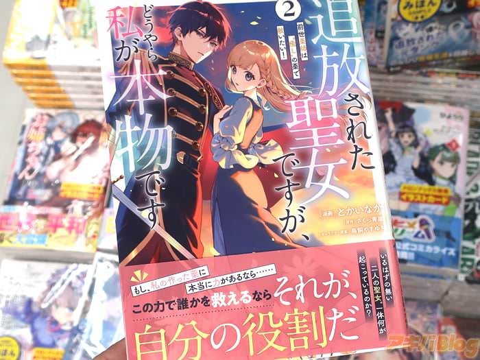さくら青嵐的轻小说、とかいなか作画的漫画版「追放された聖女ですが、どうやら私が本物です」2巻【AA】がアキバではもう出てる。裏表紙は『落ちこぼれ聖女の逆転ファンタジー!』で、オビ謳い文句は『いるはずの無い二人の聖女。何が起こっているのか?』になってた。