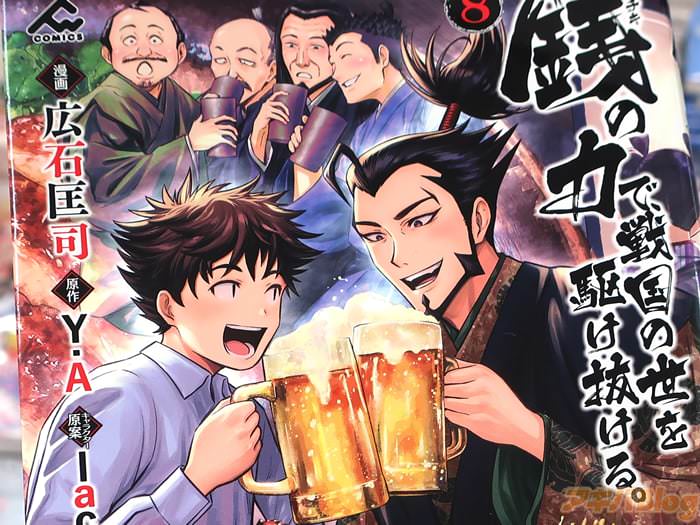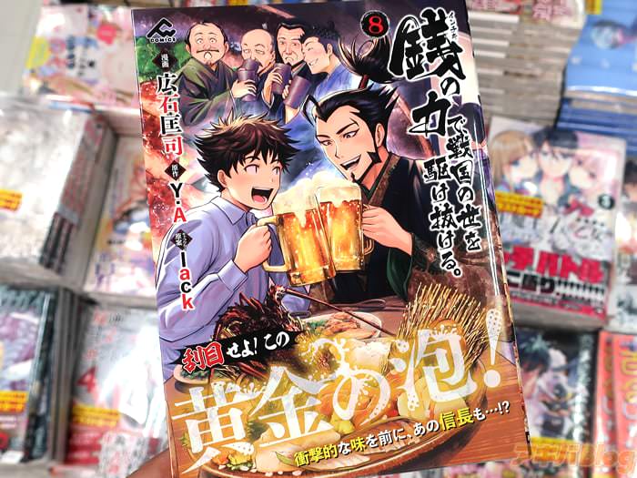 Y.A氏的小説を、広石匡司氏がコミカライズされている「銭(インチキ)の力で、戦国の世を駆け抜ける。」第8卷【AA】がアキバでは15日に発売になった。コミックス情報は『戦国でも「とりあえずビール!」』、『領主奮闘記、ますます混迷の第8巻!』、オビが『刮目せよ!この黄金の泡!あの信長も…!?』だった。
