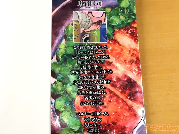 カバー折り返しで、漫画:広石匡司氏は『この巻を描くにあたって、「ビールには“ホップ”とやらが必ず入ってるけど、無いとどうなるん?」と疑問に思い、世界各地のビールの中でもホップの使用量が少なめと言われる銘柄を調べて買い集め、飲酒を重ねました。苦労の末わかったことは。ベルギーの白ビール、めちゃくちゃうまいなー』を書かれている。