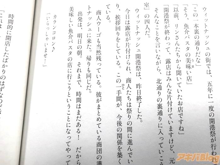 あとがきで、『この八巻では、ウィットナッシュで起きた、ちょっと大変なことが描かれています。ウィットナッシュで出てきたいろいろな物や、出てきた人たちは、この先も「水属性の魔法使い」という物語の中に、何度も出てきます。楽しみにお待ち下さい』などを書かれている。
